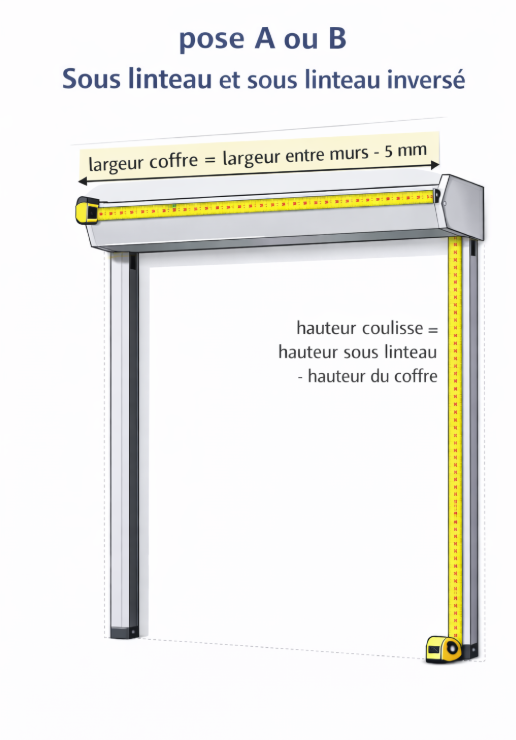 Les cotes que vous saisissez sont des dimensions de maçonnerie (entre murs ou sous linteau), à partir desquelles nous adaptons automatiquement le volet selon la pose sélectionnée.