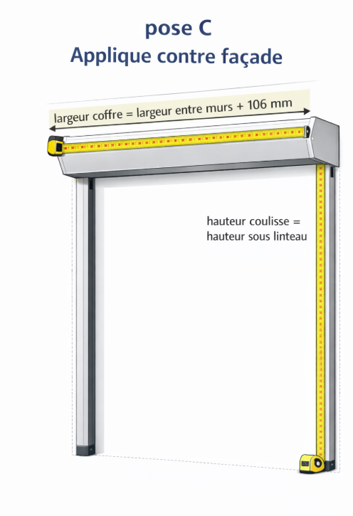 ➜ Nous retirons 5 mm à la largeur saisie afin de faciliter la pose entre murs.Pose en applique (contre façade) :